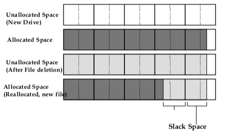 When the data stored in that sector is deleted, the sector only reallocates that space to a new data to occupy. If the new data copied to the same sector space is less than the previous data, then the difference between the old data and the new data will become the leftover slack-space which will still hold the old data until a new data of same size requests a reallocation. For instance, let us consider a new hard-drive of 1TB with “file allocation size” 512MB. Now assuming a file of 1024MB is to be stored, the HDD uses two blocks of 512MB each. If this file is to be deleted and a new file is added, the same space would actually be reused/reallocated. However, if the new file is lesser in size than the former – say 500MB – then there is an unused space of 12MB in that block of sector which is now the slack-space!